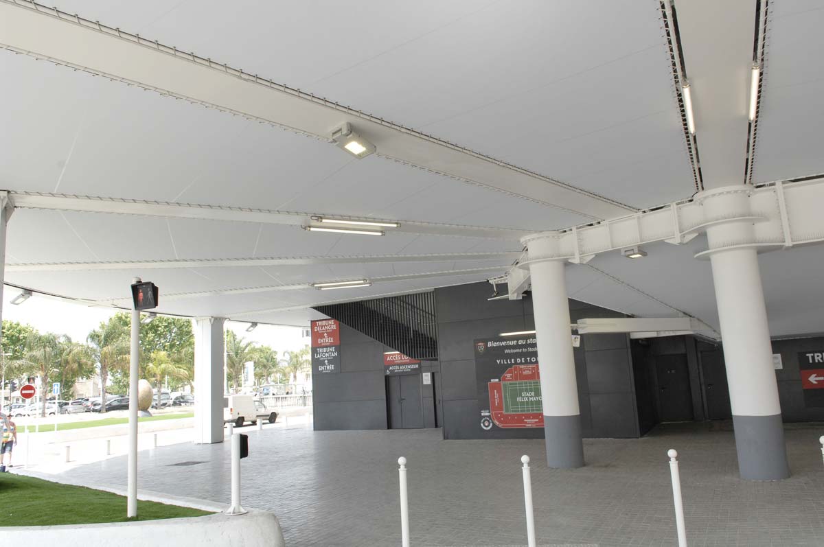 Suite à la création de la nouvelle tribune du stade Mayol à Toulon dans le Var s’est posé le problème des oiseaux. Comment faire en sorte qu’ils ne nichent pas à l’intérieur et provoquent à la fois des dégradations importantes et un risque de désagrément pour les personnes circulant à pied sous la nouvelle tribune ! Après avoir étudié plusieurs alternatives et pris en compte les directives du cabinet d'études en charge de la résistance de la tribune, il a été décidé de construire des châssis en métal laqués et cintrés afin de pouvoir y installer des bâches de protection et ainsi tenir éloigné les oiseaux ayant des velléités de nicher dans le temple du Rugby Toulonnais.
